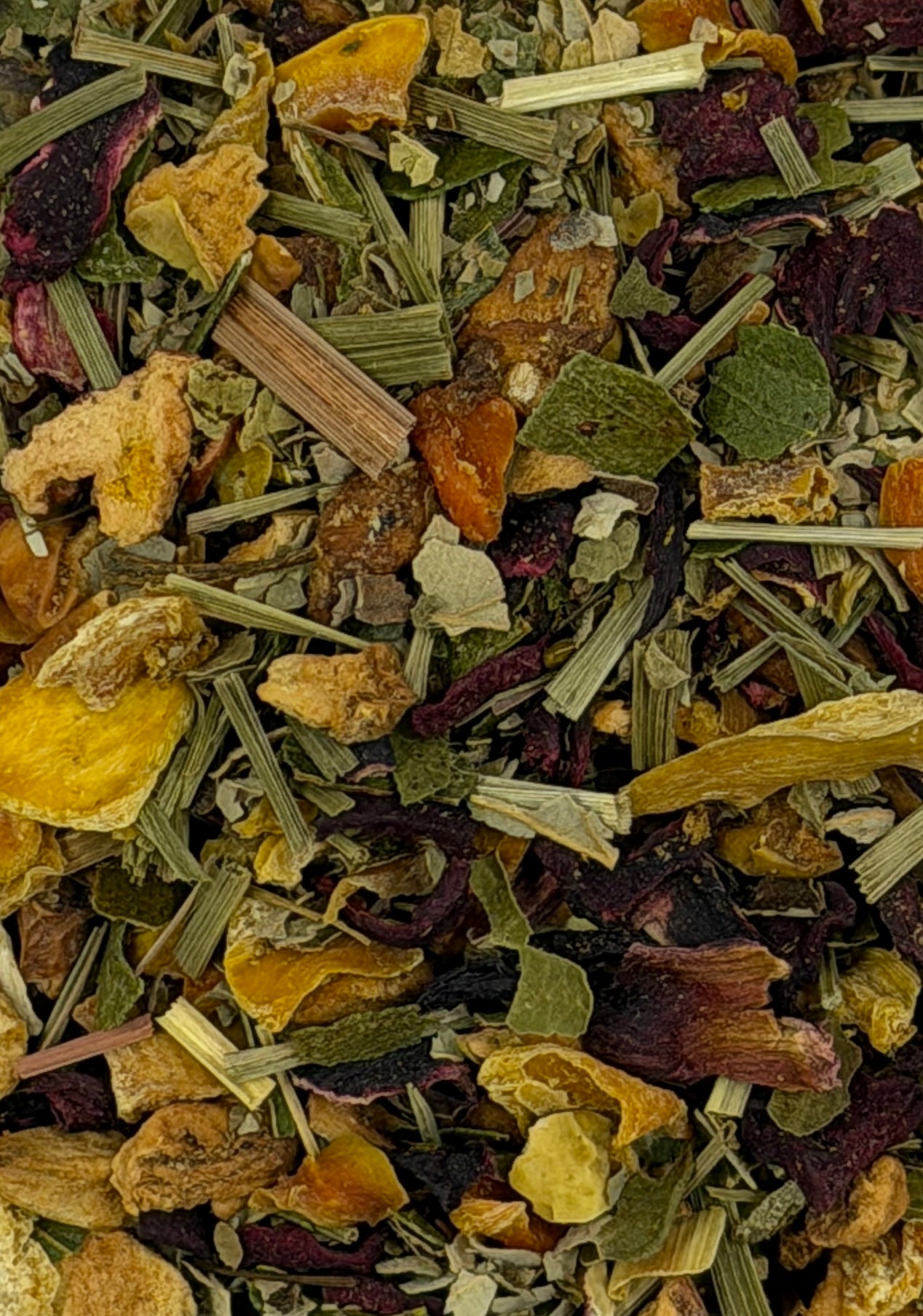 Apple pieces, carrot flakes, blackberry leaves, eucalyptus leaves, beetroot, hibiscus blossoms, lemongrass, flavoring, freeze-dried tangerine-orange pieces, orange slices.