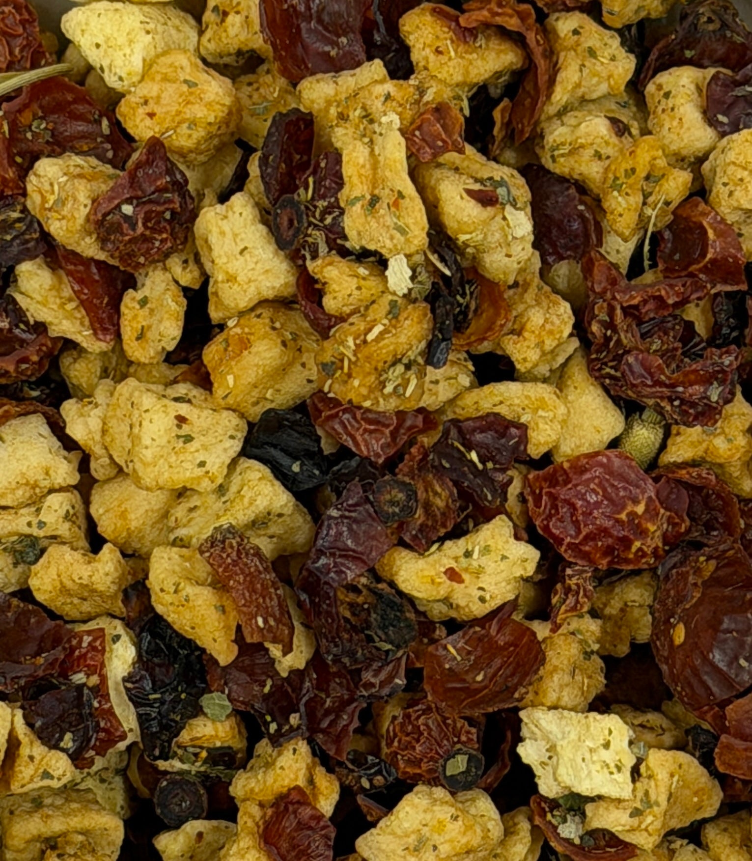 A blend of juicy peaches with notes of sweet apples and chamomile combine in this harmonious and gentle herbal teas. Each sip offers a perfect balance of peach flavor making it a delightful treat to enjoy hot or iced.